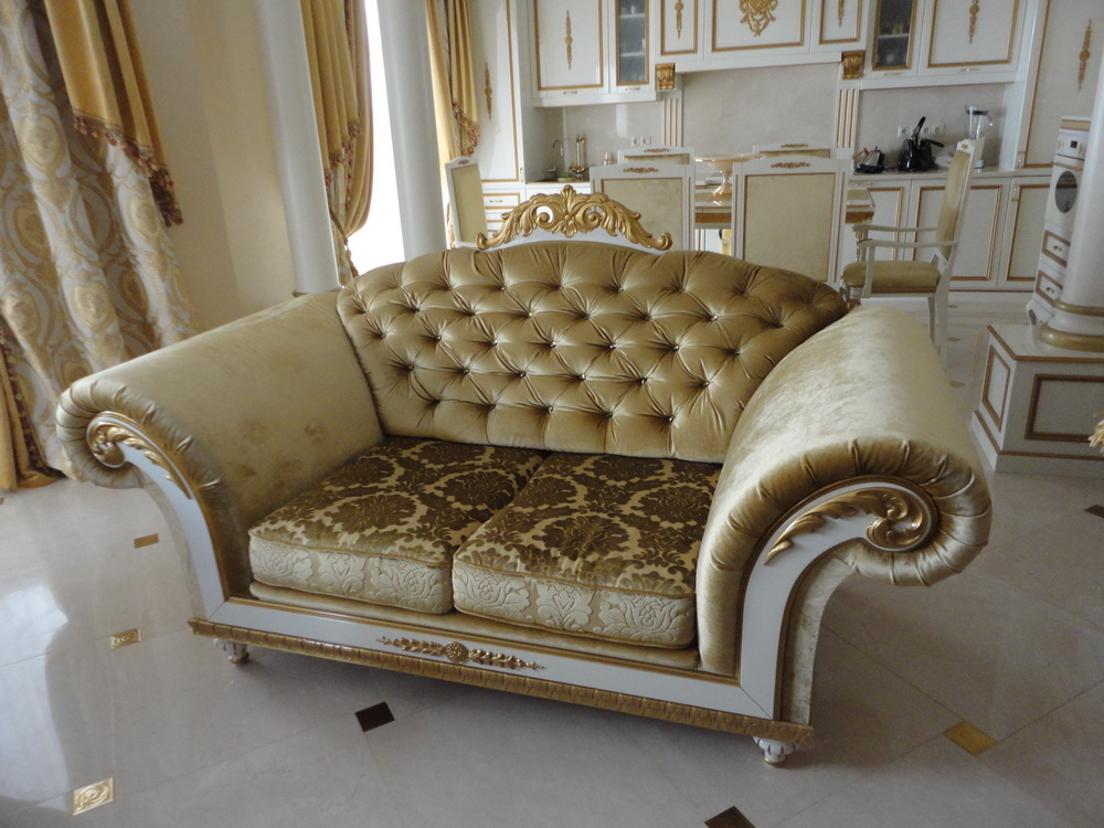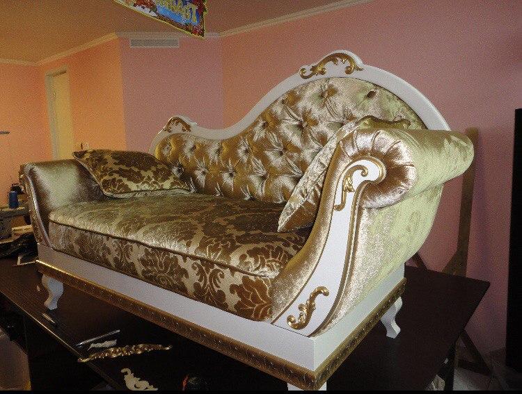 Диван и кушетка в стиле Барокко. Мебель изготовили по проекту дизайнера. Комбинированная двухкомпонентная обивка.