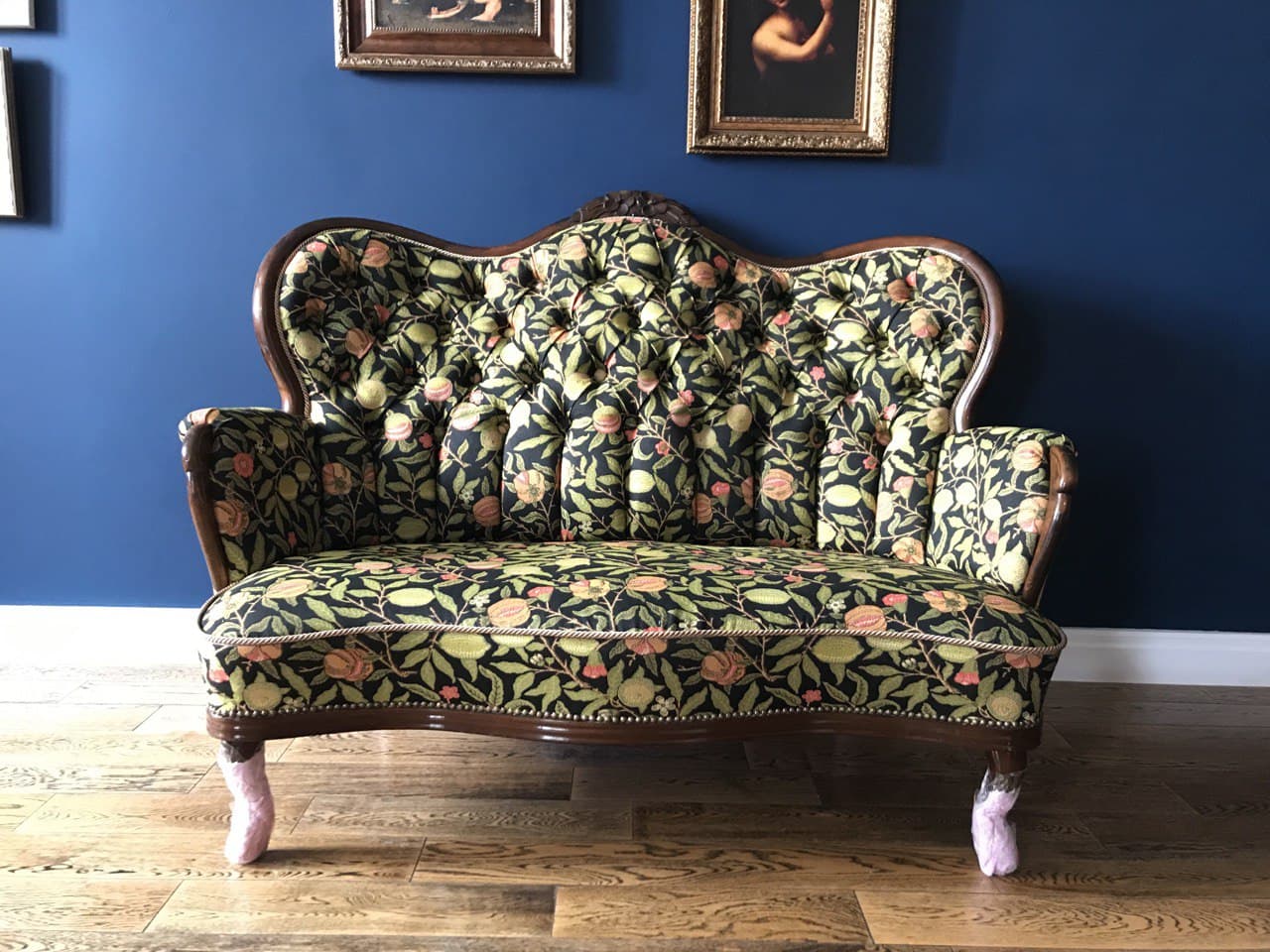 Мастера от «Мебельер» произвели реставрацию дивана в классическом стиле. Поменяли пружинный блок и наполнитель на сидении, наполнитель в спинке дивана. Дополнительно проклеивали и усилили каркас дивана. Произвели полную обивку с применением каретной стяжки на спинке дивана. Комбинированная обивки - велюр и гобелен.
