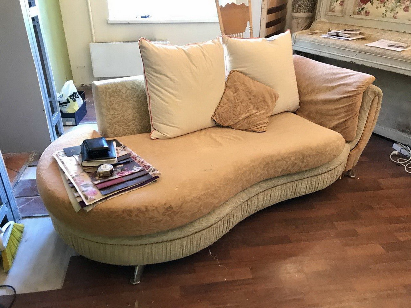 На диване-кушетке провели работы по ремонту каркаса, замене поролона и обили новой тканью из коллекции Nocturen.