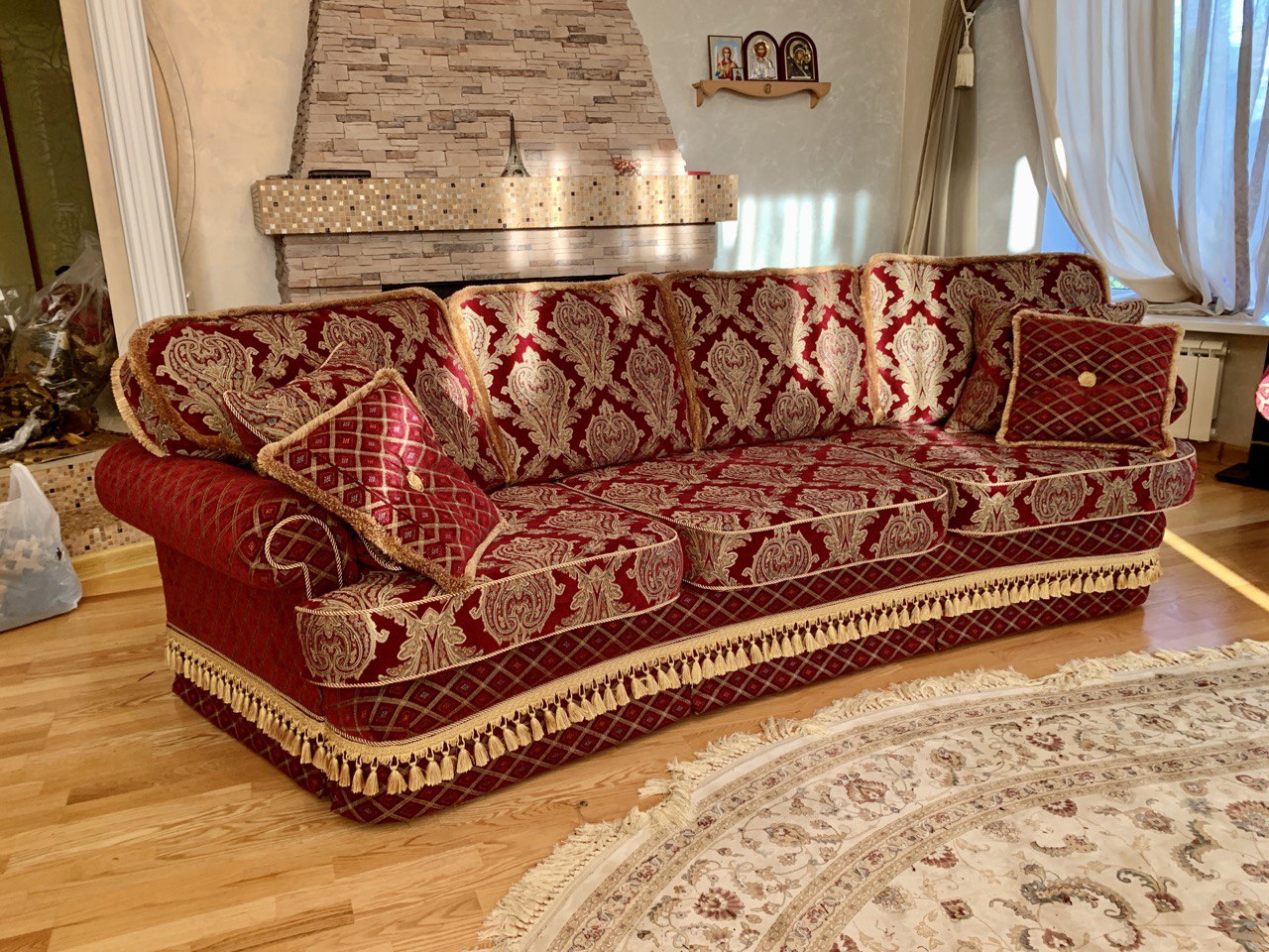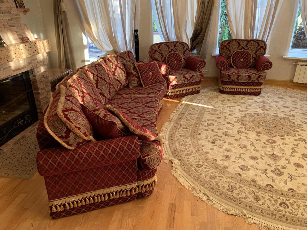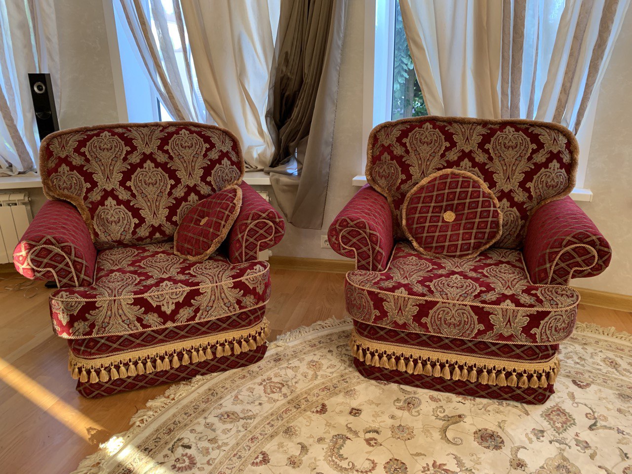 Обивка комплекта мягкой мебели в Греко-римском стиле. Работы по обивке проводились в доме у клиента. Ткань – жаккардовый шенилл пр-ва Турции.